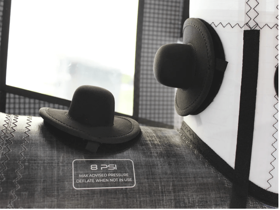 Rende possibile avere pressioni diverse nella Leading edge e nel montante e semplifica qualsiasi riparazione; quindi, sempre più persone ora scelgono questo, anche se potrebbero volerci 30 secondi in più per gonfiare questa ala rispetto a un’ala con una sola valvola. Ma noi siamo motivatissimi e quei 30 sec li facciamo diventare 5 !!